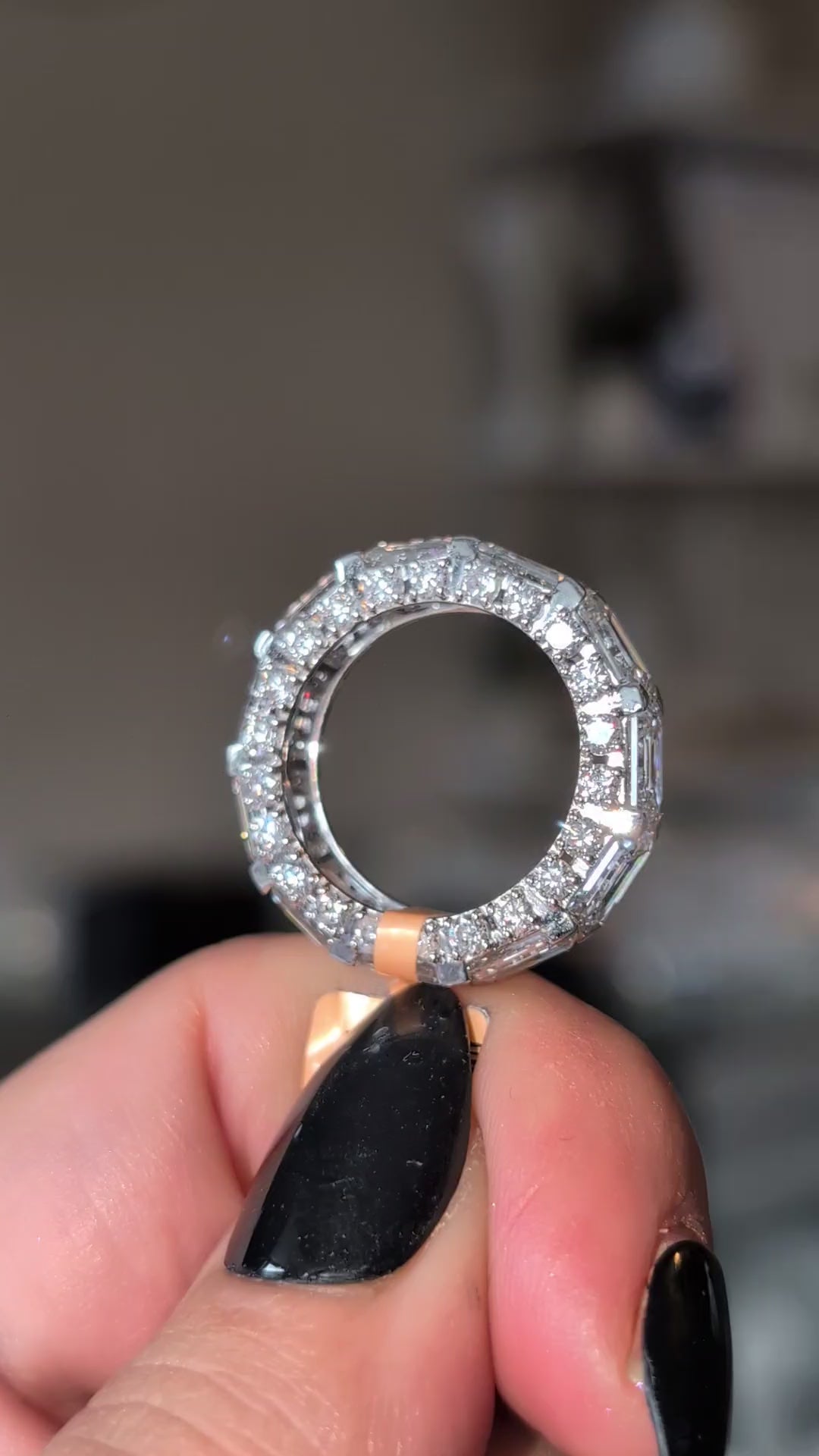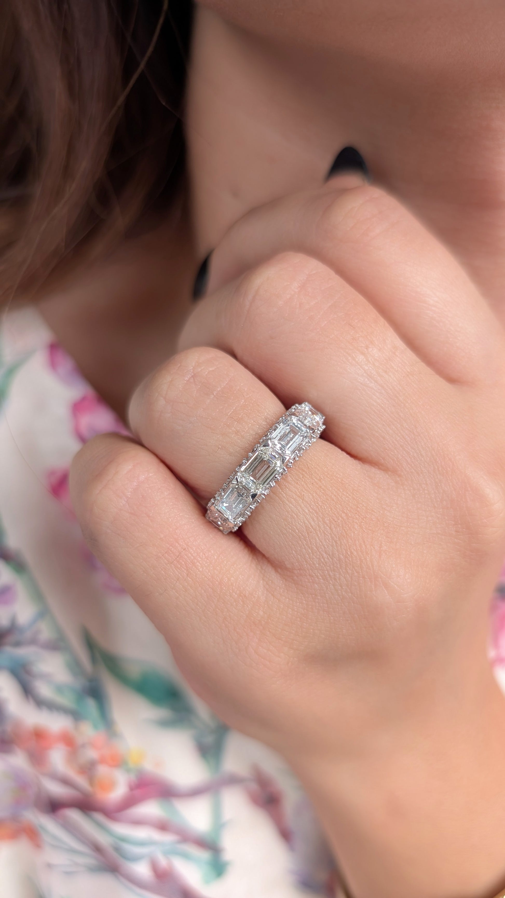 Emerald cut with round diamonds on both sides